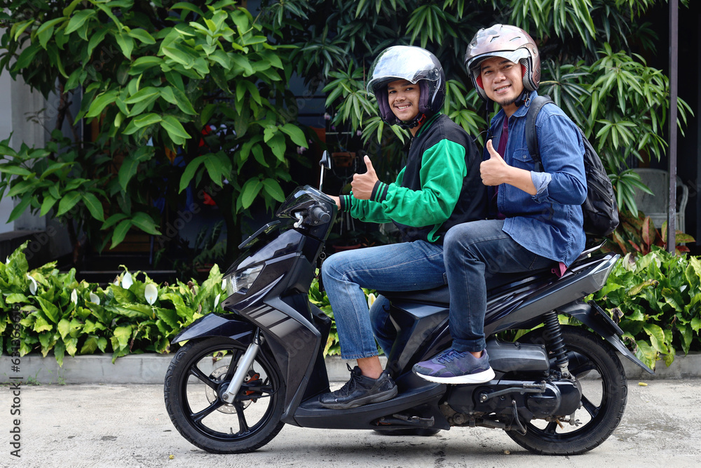 Back view of happy commercial motorcycle taxi driver and his passenger showing thumb up