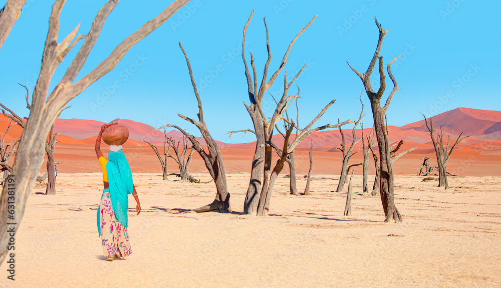 Woman in traditional green dress carrying heavy jug of water on her head and walking on the Dead trees in Dead Vlei - Sossusvlei, Namib desert, Namibia