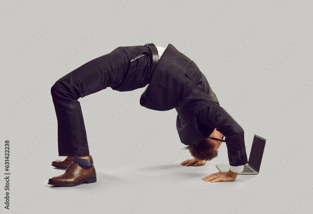 Funny energetic businessman in suit practises yoga while working on his modern laptop computer. Fit flexible young business man doing bridge pose position on studio floor while using his notebook PC
