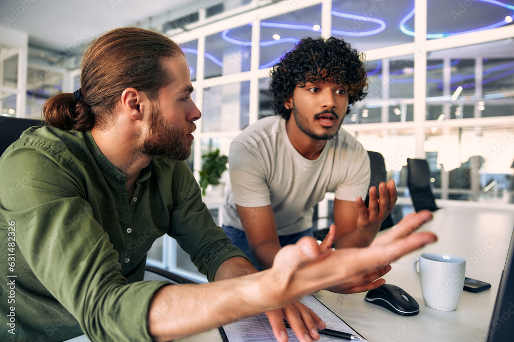 Male freelancers argue about working in a coworking space office