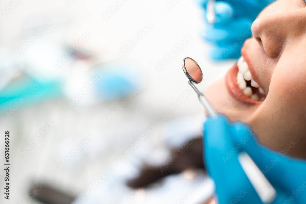 Closeup smile of asian woman having dental teeth examined dentist check-up in Clinic.