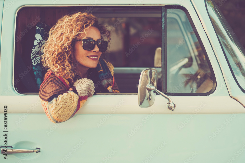 Vintage travel style image concept lifestyle. One cheerful happy woman enjoy destination sitting inside her blue classic van looking outside from the window. Freedom and alternative vehicle journey