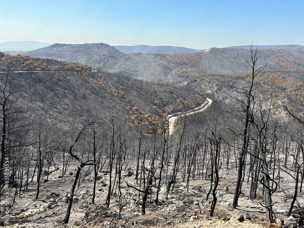 Land after recent wildfire. Dead forest, barren of plants mountains with burned trees trunks. Roads cut trough burnt down hillsides. Site of bushfire, Mediterranean landscape after disaster. Greece.