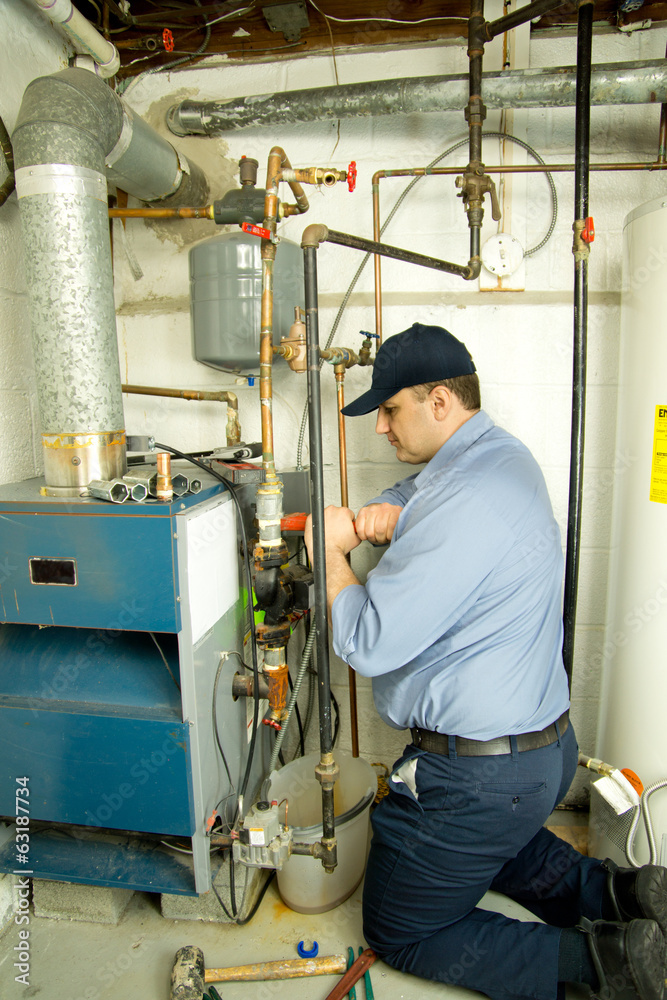 Plumber fixing gas furnace