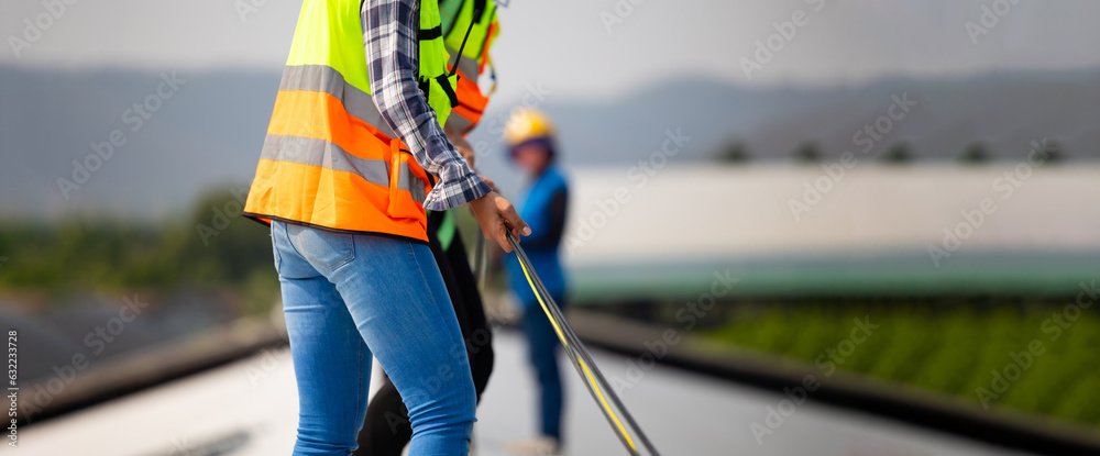 Close up hand. Electrician female pulling wire into PVC pipe electrical engineering female Installing Solar Cell panels on Roof. Solar energy clean and green alternative energy concept.