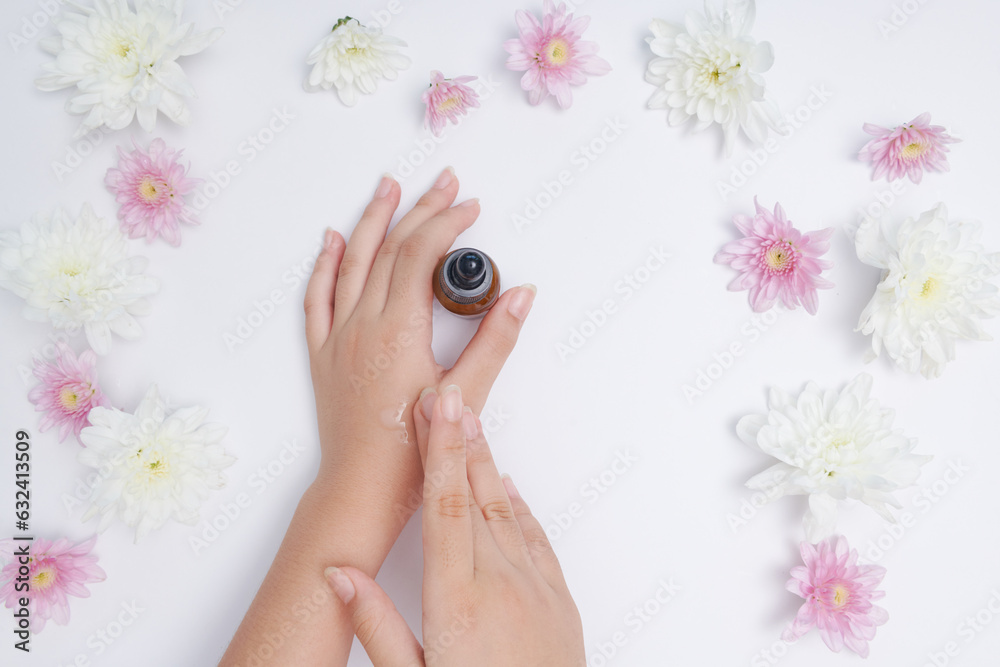 woman holding cosmetics bottle with pipette. skin care, young skin, essence oil, Vitamin C. Hands beautiful woman dropping serum collagen moisturizer of face into hand. Flat lay, Top view, spa concept