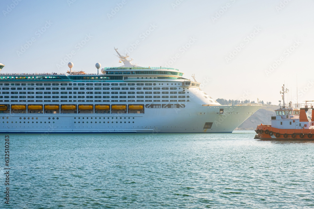 Cruise ship docked in port in town Bar, Montenegro on Adriatic sea. Summer vacation destination in Europe. Luxury cruise