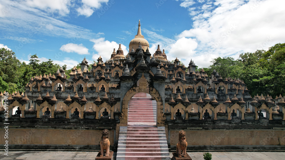 Aerial view sandstone pagoda in Wat Pa Kung Temple or Wat Prachakom Wanaram in Si Somdet district, Roi Et Province, northeast of Thailand.