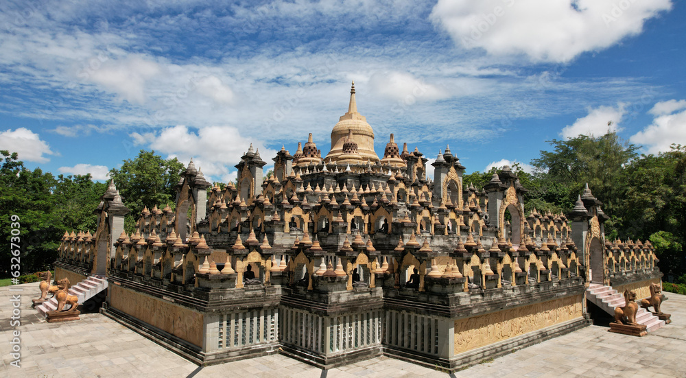 Aerial view sandstone pagoda in Wat Pa Kung Temple or Wat Prachakom Wanaram in Si Somdet district, Roi Et Province, northeast of Thailand.