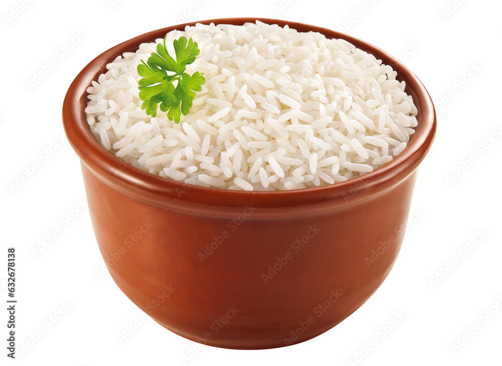 cumbuca de barro com porção de arroz branco com salsa isolado em fundo transparente