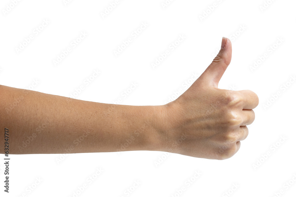 Woman hand shows thumbs up sign isolated on white background, with clipping path. Full Depth of field. Focus stacking.