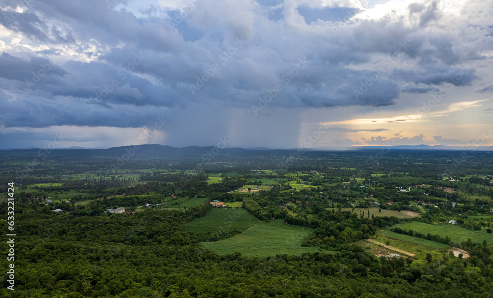 Aerial view of rain over rural fields next to the Mekong River in Mukdahan province, Thailand.