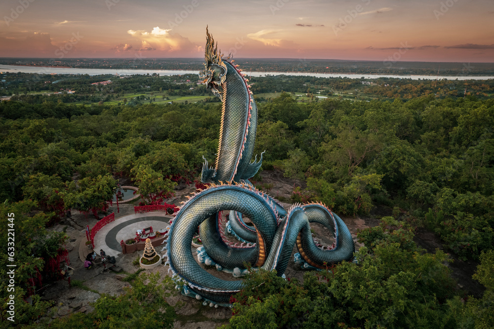 Phaya Si Mukda Maha Muni Nilapala Nakkharat The King of giant Naga statue at Wat Phu Manorom in sunset,Mukdahan Province Thailand.