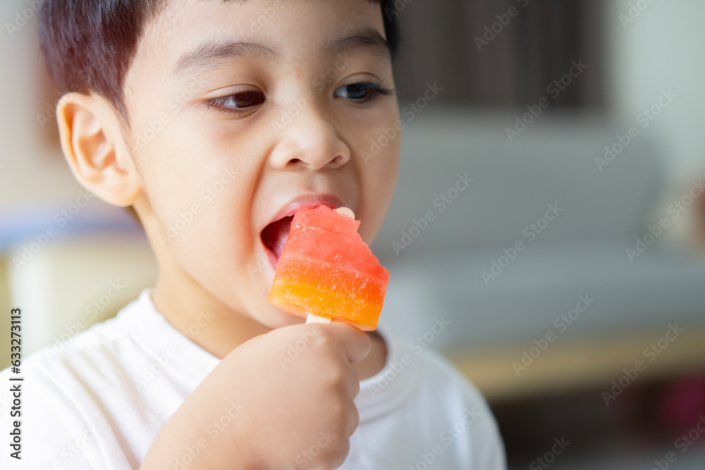 Close up of joyful Asian child boy eating ice cream in a living room at home.
