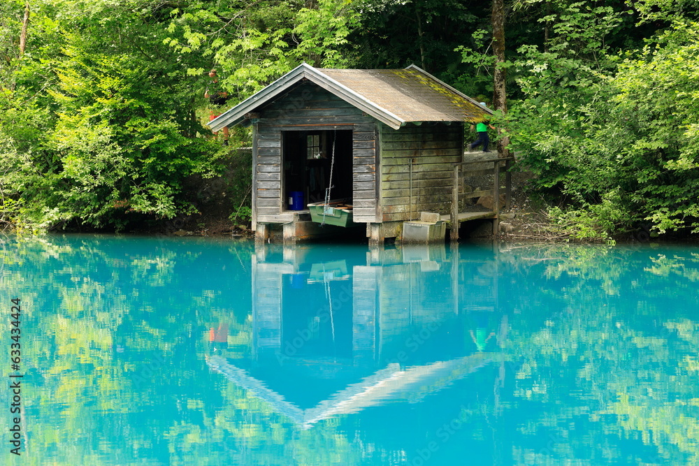 Kleine Hütte am Klammsee in Kaprun spiegelt sich im Wasser
