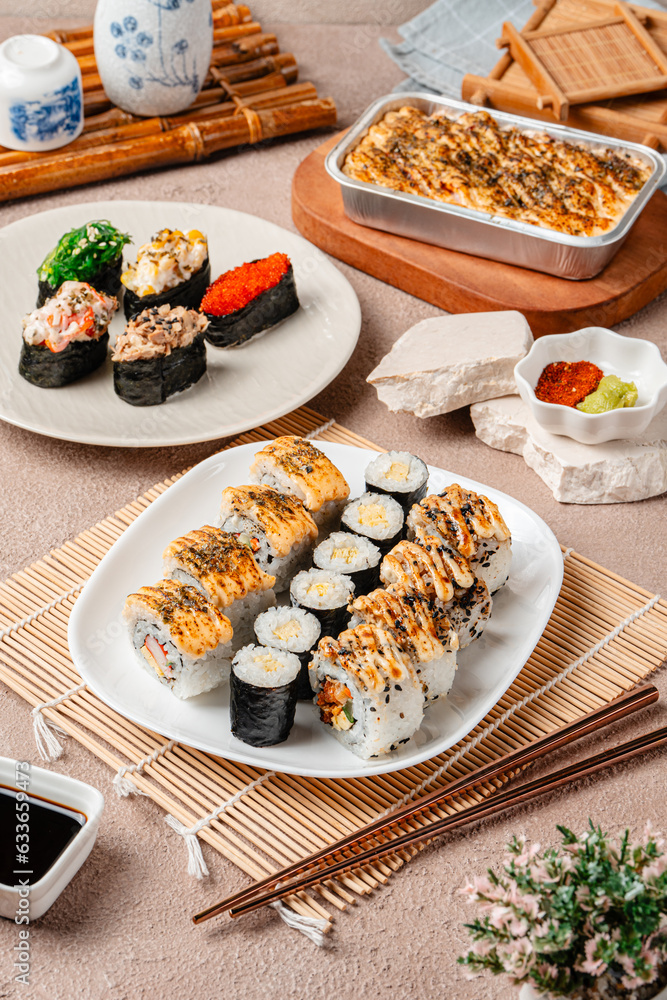 sushi is a Japanese dish of prepared vinegared rice, usually with some sugar and salt, accompanied by a variety of ingredients such as seafood, often raw and vegetables.