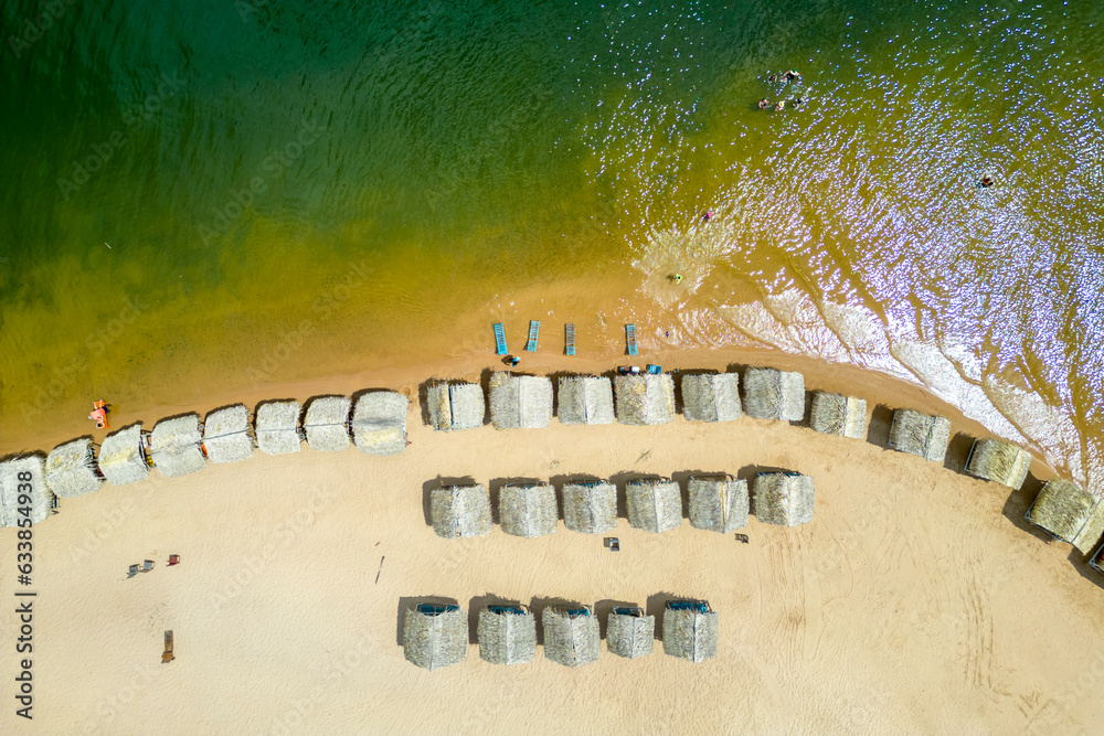 Aerial view of palm-thatched beach huts at Pindobal, a freshwater beach on the banks of the Tapajos river in Belterra, Para, Brazil.