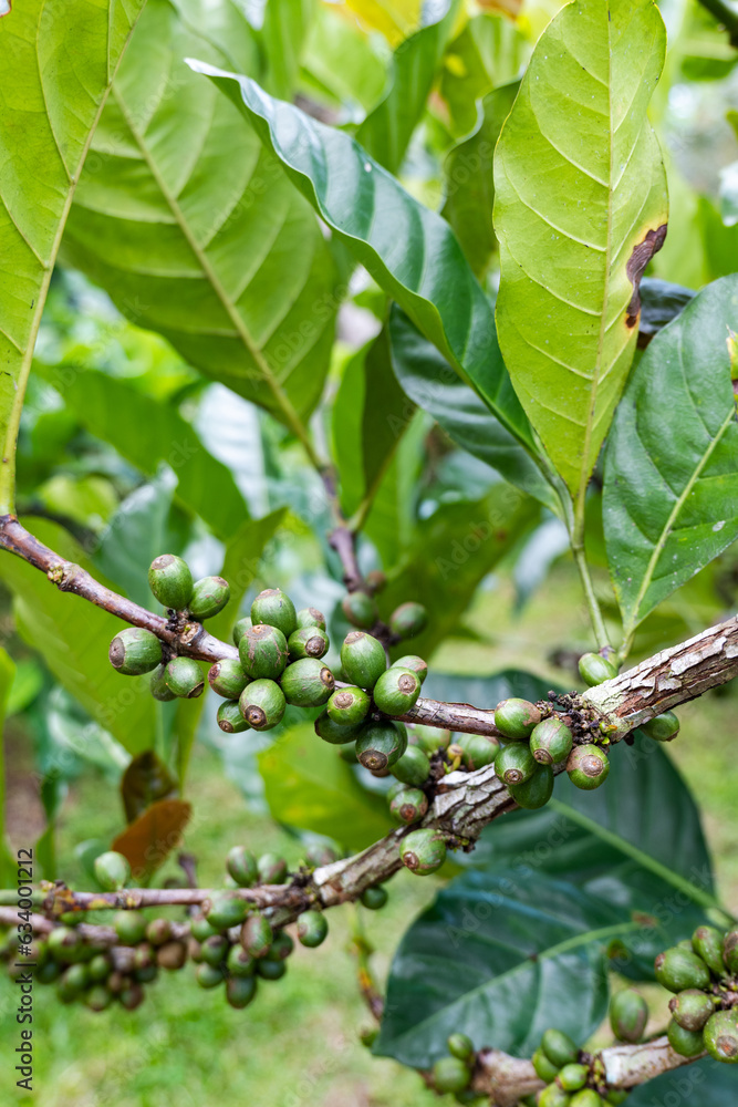 Coffee Plants on trees close-up, coffee crop berries for harvest in Java, Indonesia for Java coffee