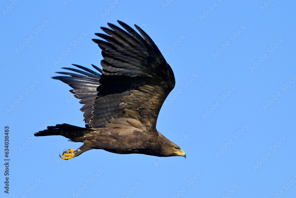 Lesser Spotted eagle Clanga pomarina excellent close up, bird in flight, blue sky natural background, spring