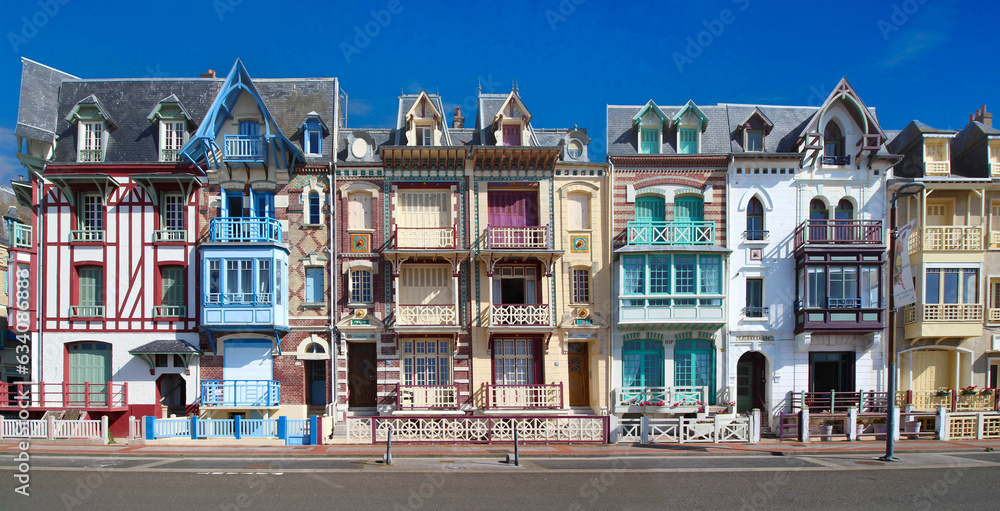 Famousfacades on the seaside of Mers-les-Bains, limit of Hauts-de-France and Normandy. France