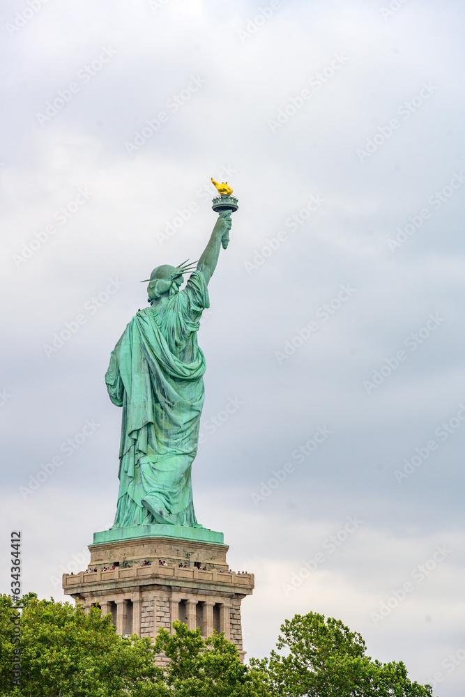 New York, New York, United States. August 07, 2023. Dramatic and detailed image of the Statue of Liberty with strong shades of green, sky with many clouds and very high resolution.