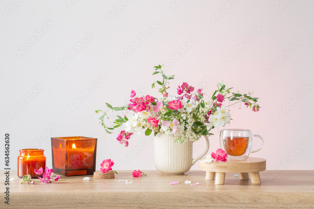 summer flowers, burning candles and cup of tea on light background