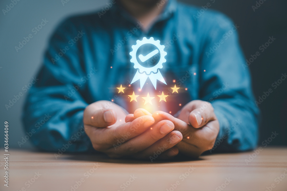 Businessman holding and showing the best quality assurance with golden five stars for guarantee product and ISO service concept.