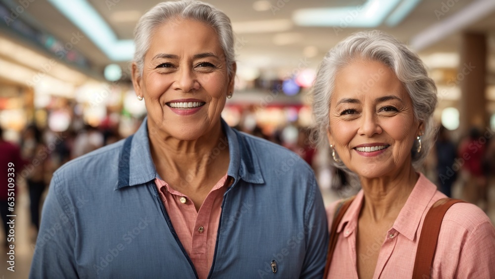 Two older women standing together in a shopping mall