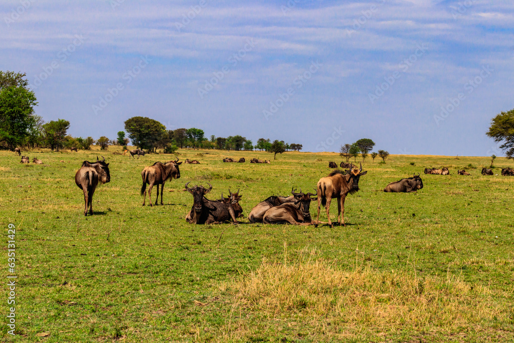 Herd of blue wildebeest (Connochaetes taurinus) in savannah in Serengeti national park in Tanzania. Great migration