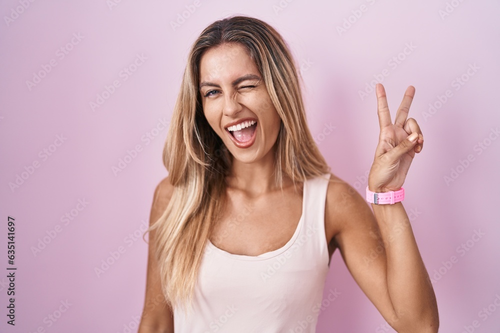 Young blonde woman standing over pink background smiling with happy face winking at the camera doing victory sign with fingers. number two.