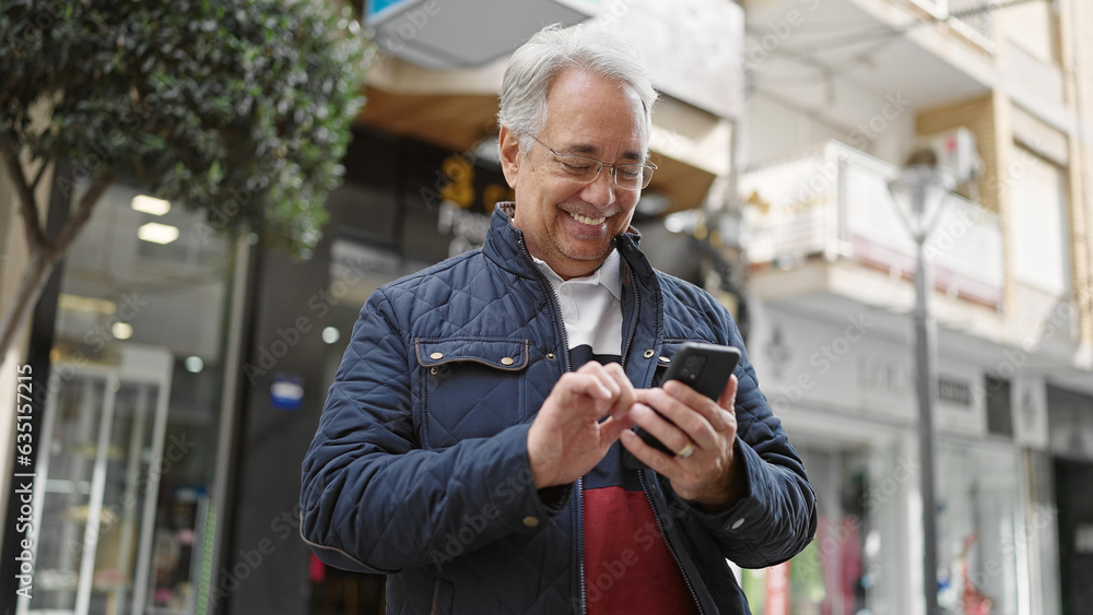 Middle age man with grey hair using smartphone smiling at street