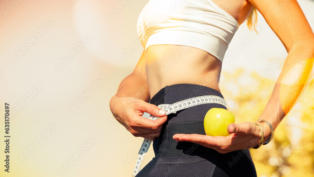 Woman with slim body measuring waistline and holding apple- diet food, weight loss, healthy nutrition concept