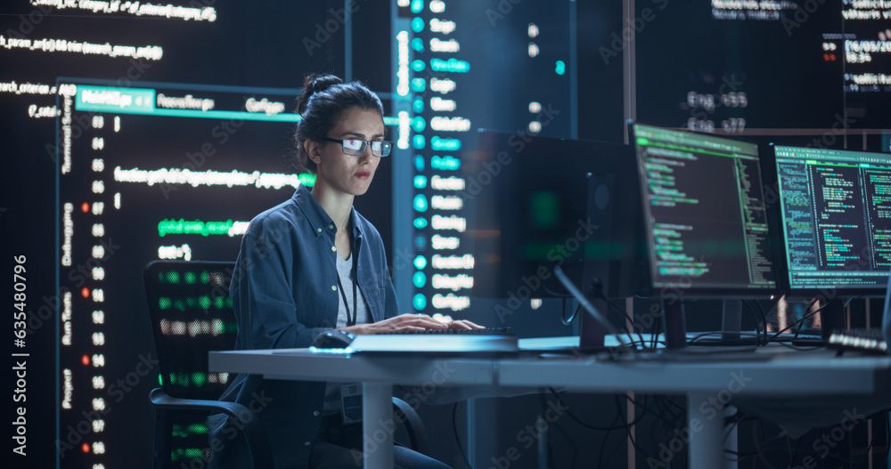 Female Programmer Working in Monitoring Control Room, Surrounded by Big Screens Displaying Lines of Programming Language Code. Portrait of Woman Creating a Software. Futuristic Coding Concept.