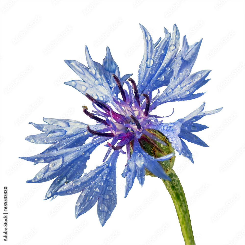 Centaurea cyanus or cornflower with raindrops isolated