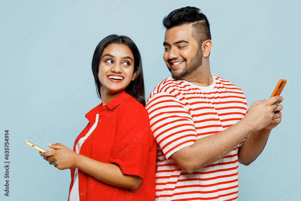 Young fun couple two friends family Indian man woman wear red casual clothes t-shirts together hold use mobile cell phone stand back to back look to each other isolated on plain blue color background.