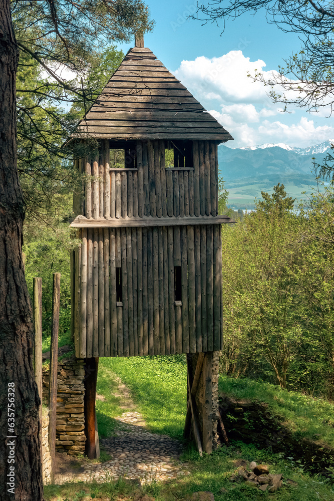 Wooden tower in Archaeological museum of Havránok in Slovakia