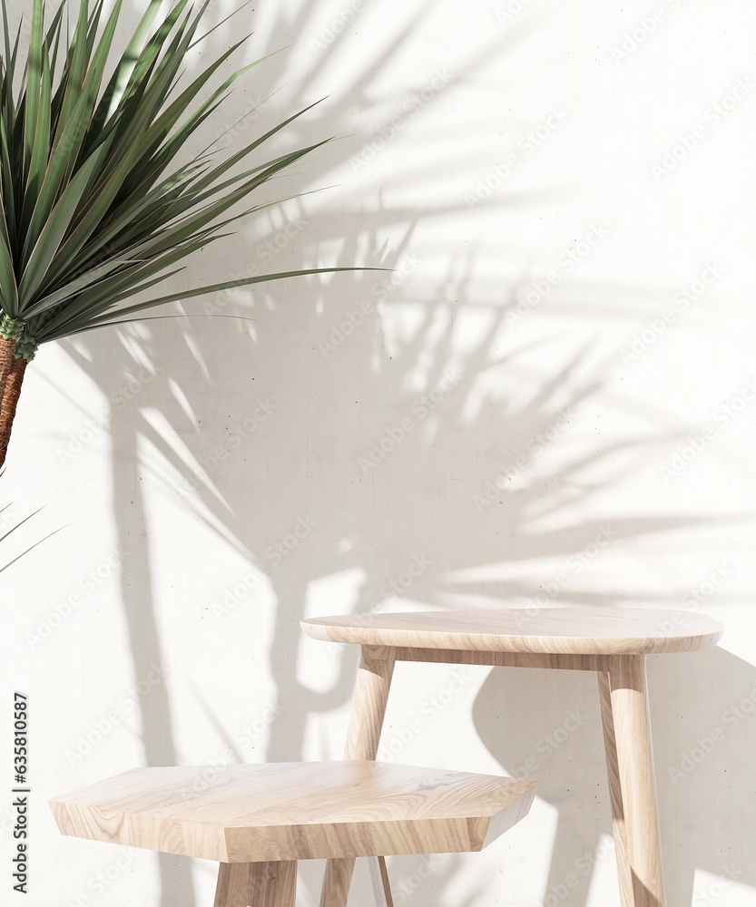 Two geometric wooden pedestal side table podium in different level, dracaena tree in sunlight, white cement wall. Luxury organic cosmetic, skincare, body care, beauty product display background 3D
