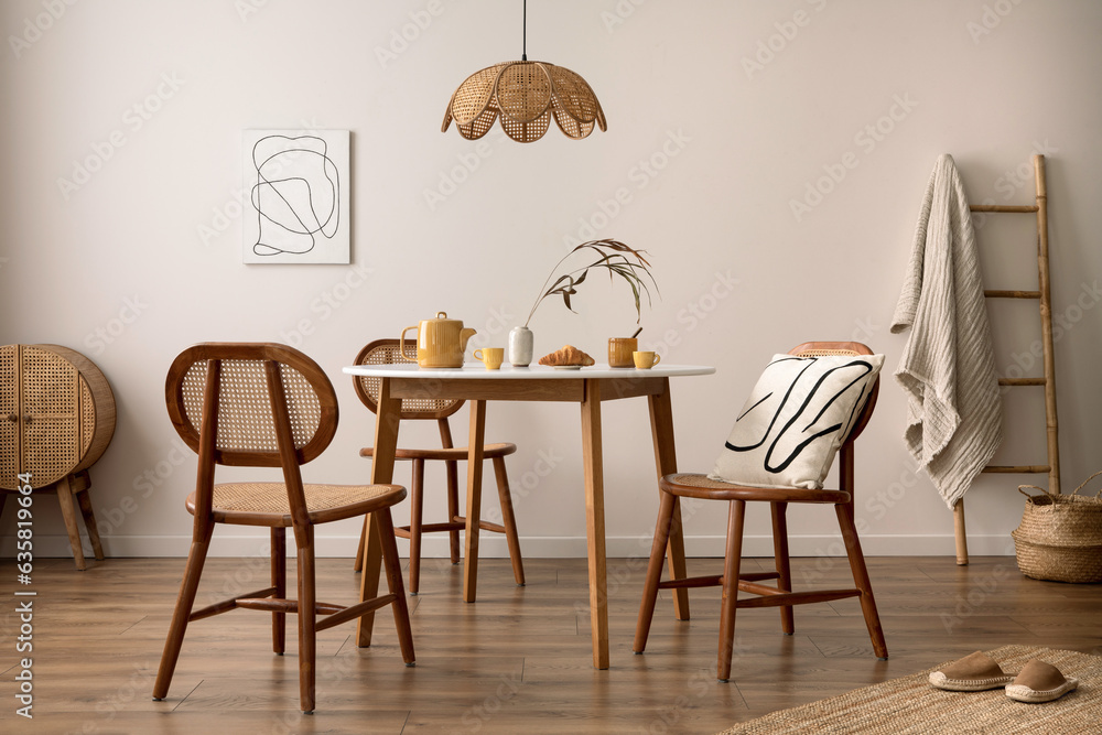 The stylish dining room with round table, rattan chair, wooden commode, poster and kitchen accessories. Beige wall with mock up poster. Home decor. Template.