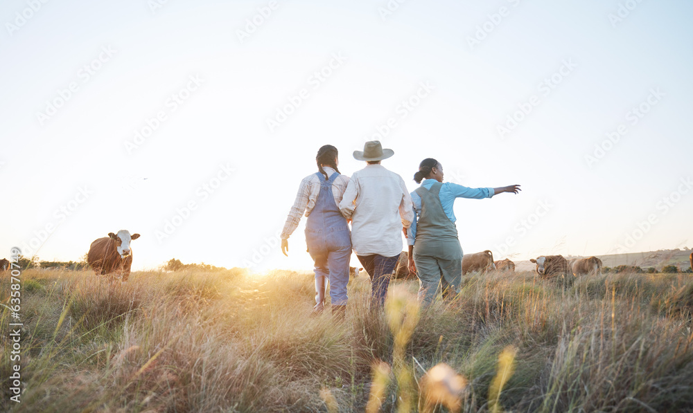 Farm, agriculture and women in field with cow pointing for inspection, livestock health or ecology. Agro business, countryside and people with cattle for dairy, beef production or sustainable farming