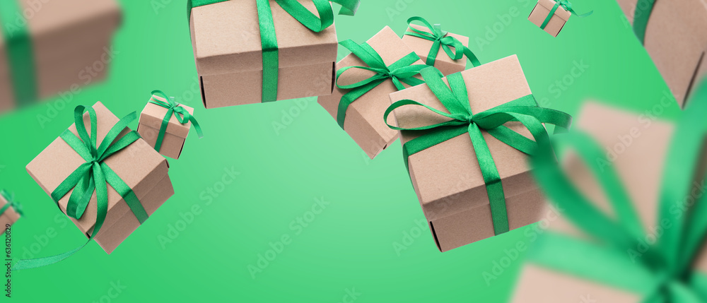 Christmas gift boxes with green ribbon falling or flying in air on green background. shopping Banner