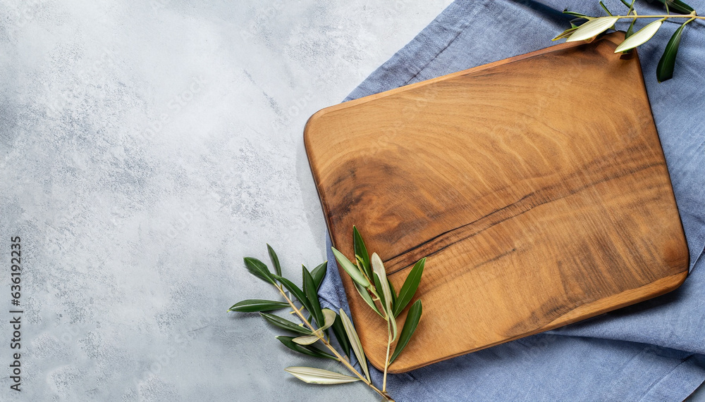 Wooden cutting board for cooking, blue kitchen napkin and olive branch on a gray stone background. Top view, copy space for text
