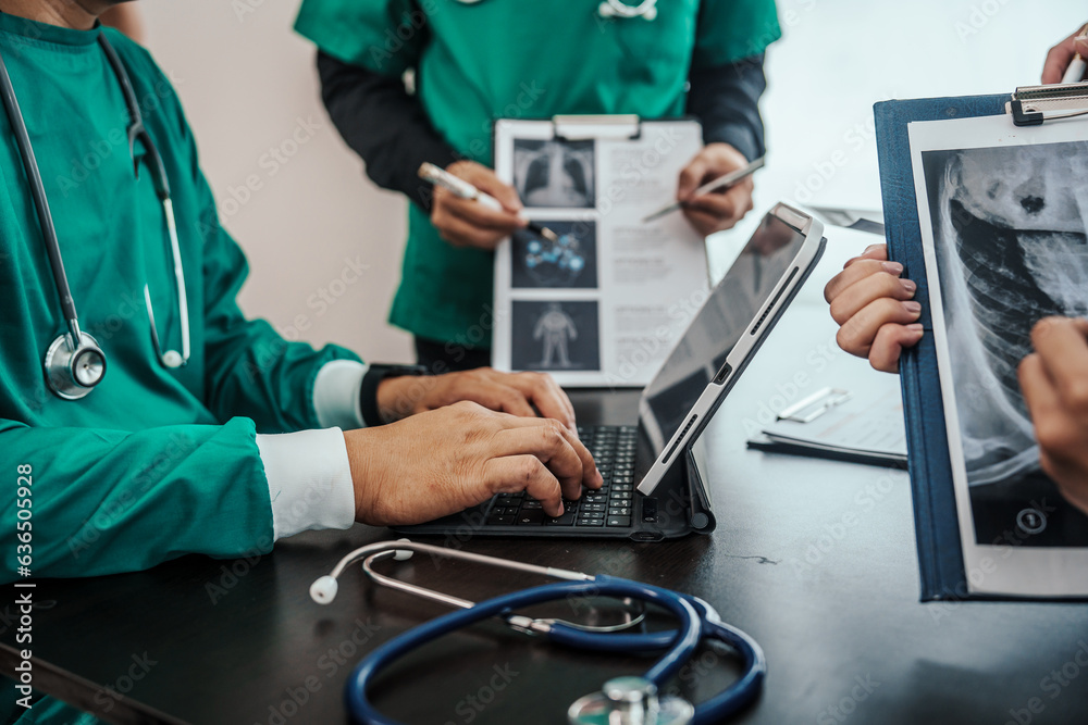 Plastic surgery Medical meeting healthcare and doctors, orthopedic surgeon, orthopedist, ER surgery team discussing on diagnostic exam, Breast implants, Breast enlargement surgery, Hair transplant