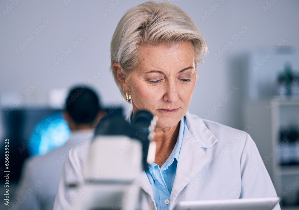Science, tablet and medical with woman in laboratory for planning, research and pharmacy. Medicine, healthcare and digital report with mature scientist reading online for email, data and result
