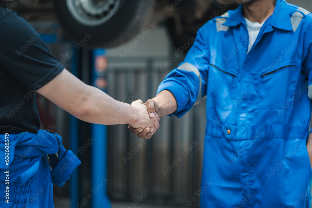 Two professional auto mechanics shaking hands, all kinds of car specialists.
