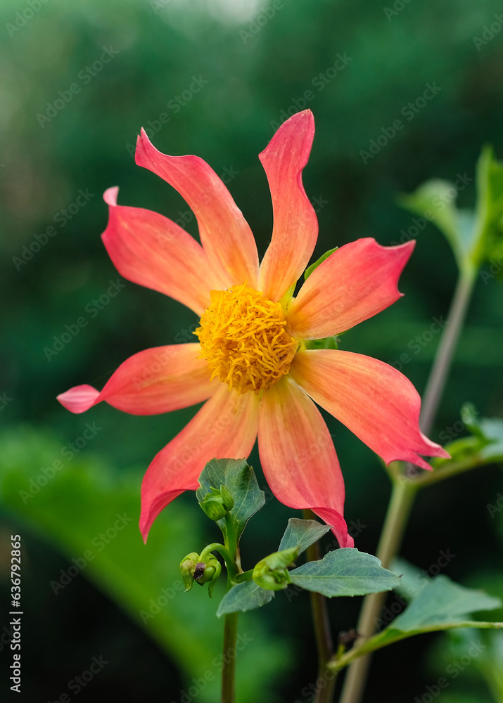 Red dahlia flower on a background of green leaves in the botanical garden in Batumi. Annual dahlia flower close-up. Blooming red dahlia in a summer garden.