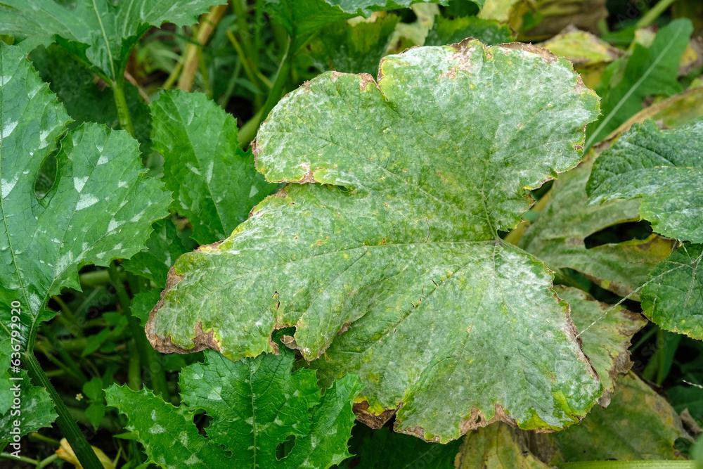 White coating on the leaves of zucchini in the open field. Powdery mildew on squash. Diseases of plants in the garden. Vegetable crops. leaves curl and dry. Fungal disease Powdery mildew on zucchini