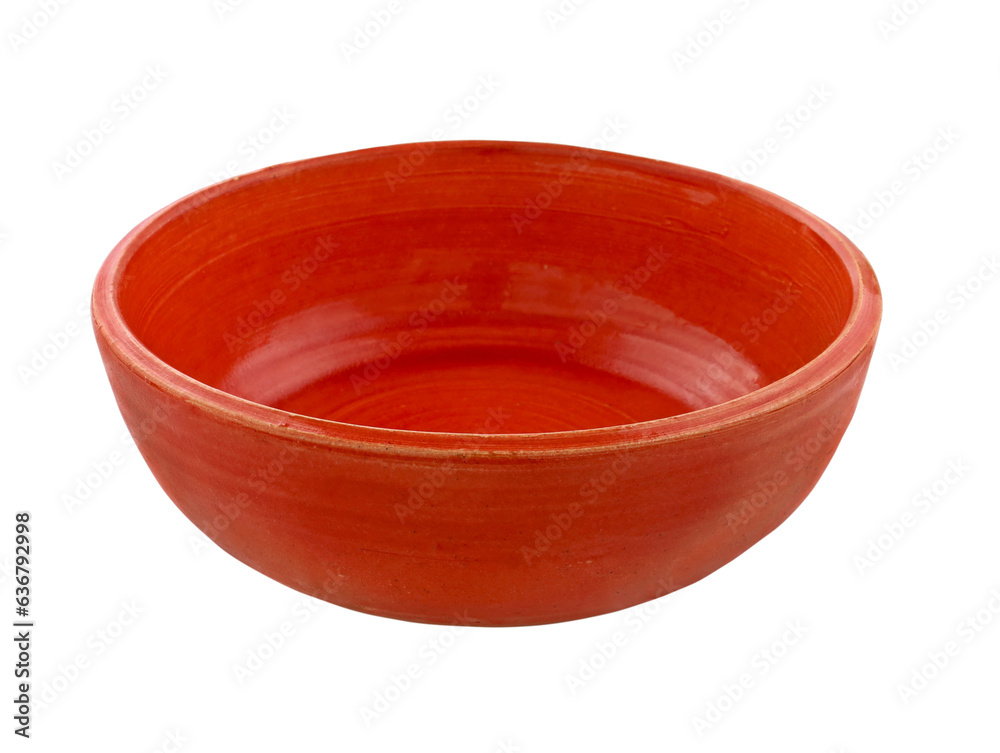 Colored ceramic dishes close-up handmade isolate. Epty Red ceramic bowl on a white background. Hobby ceramics earthenware. Bright utensils for food.