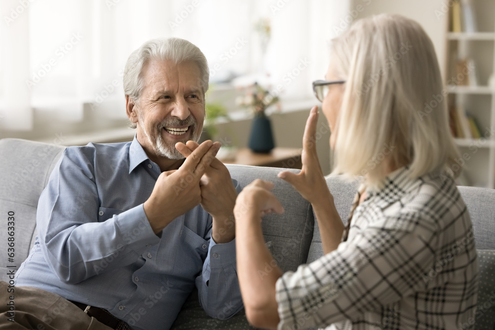Positive senior husband with hearing disorder, disability talking with hands to mature wife, using finger signs for conversation, speaking gesture language, smiling, laughing, sitting on sofa