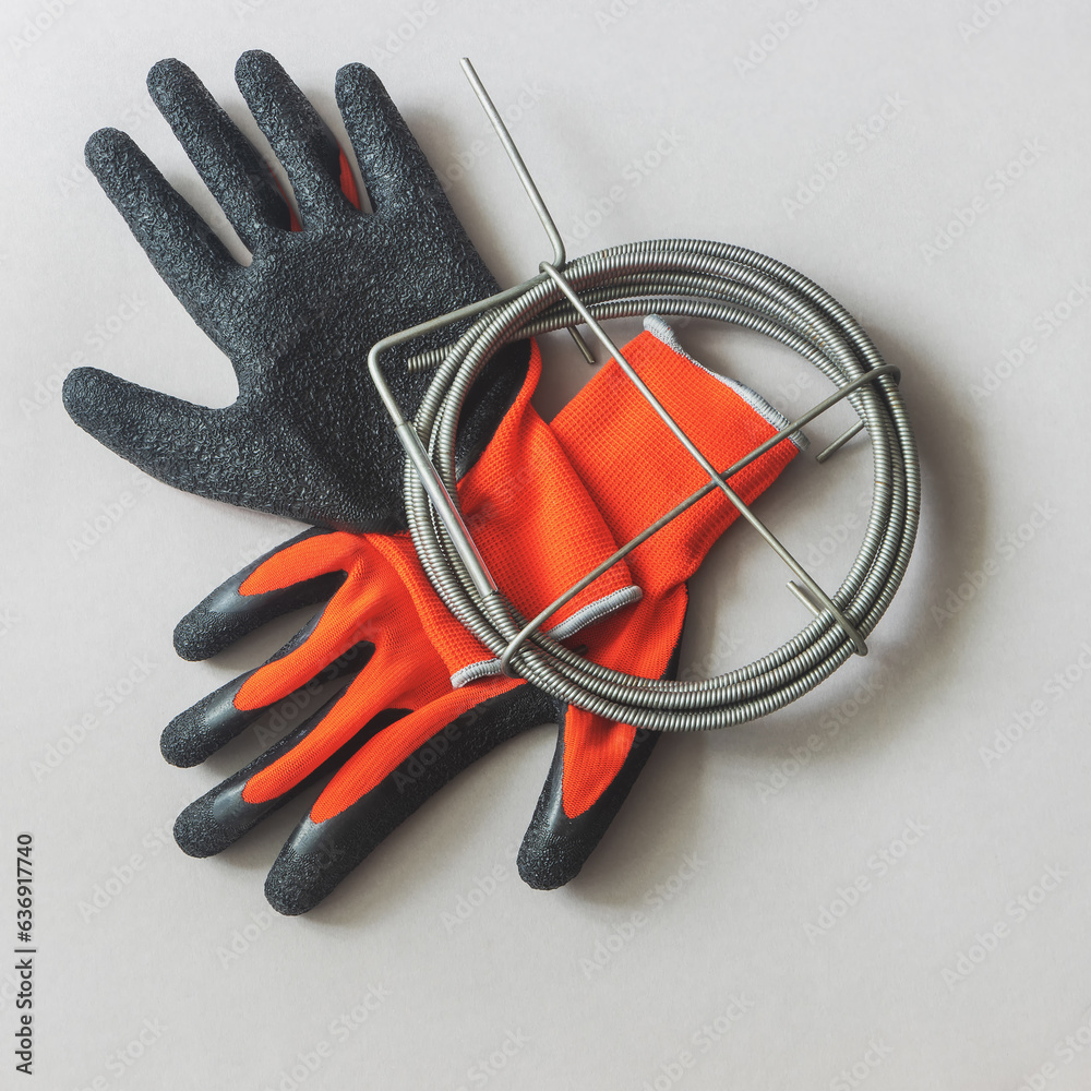 Metal cable for cleaning sewer pipes and knitted red gloves with black latex covered palms
