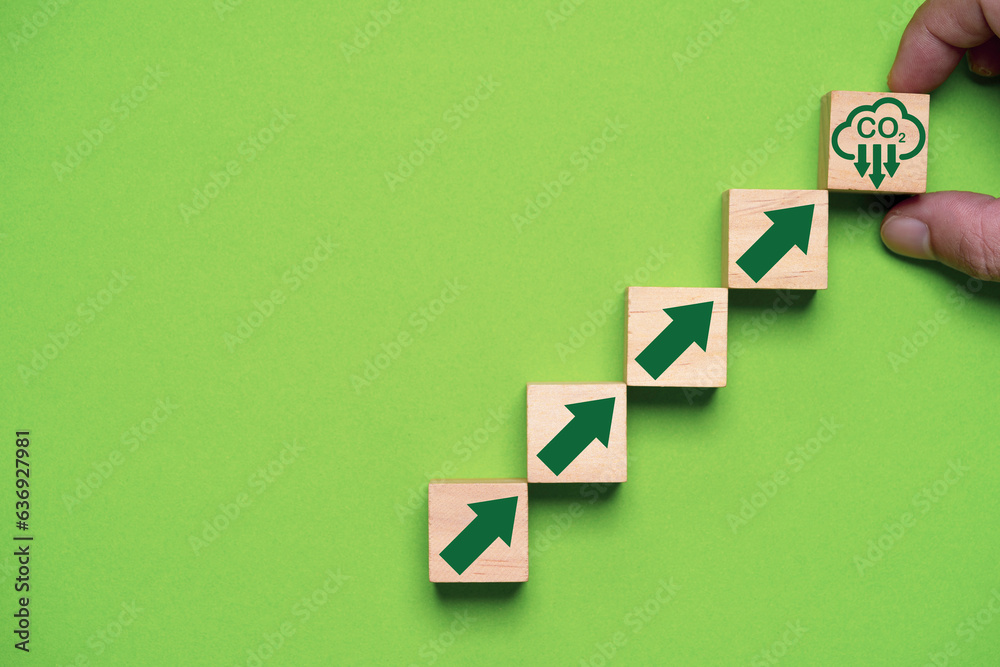 Hand putting CO2 reducing with up arrow for decrease CO2 , carbon footprint and carbon credit to limit global warming from climate change, Bio Circular Green Economy concept.